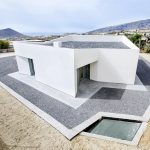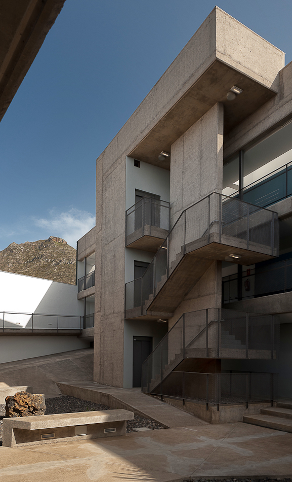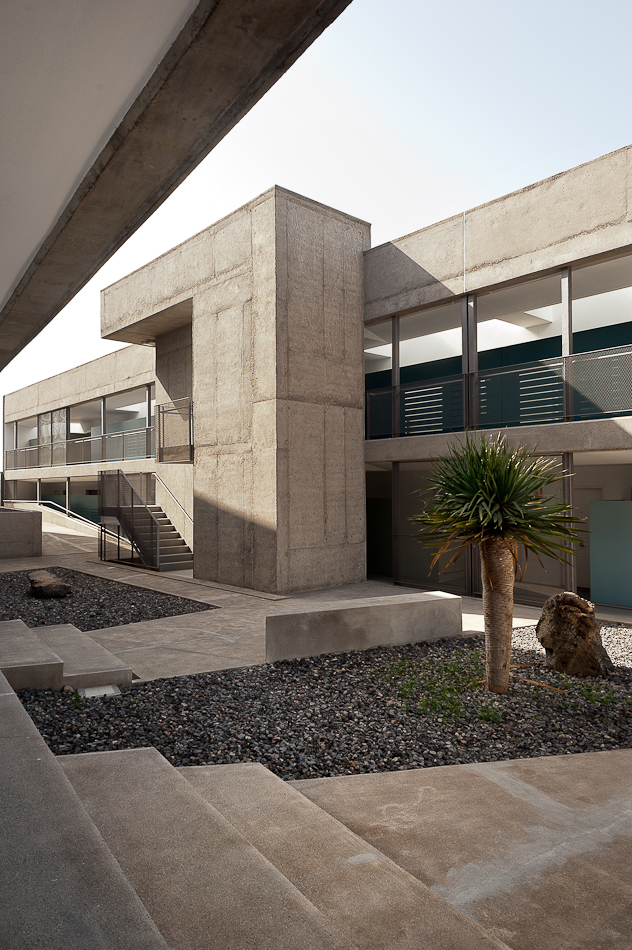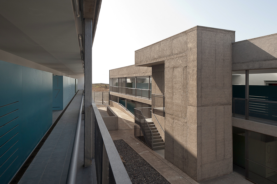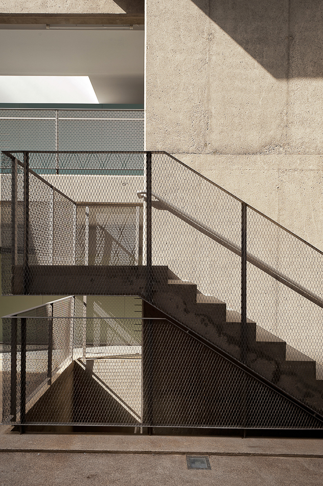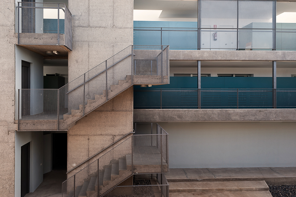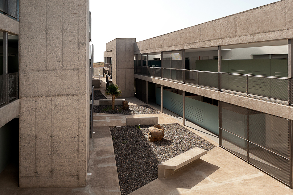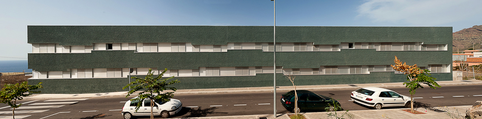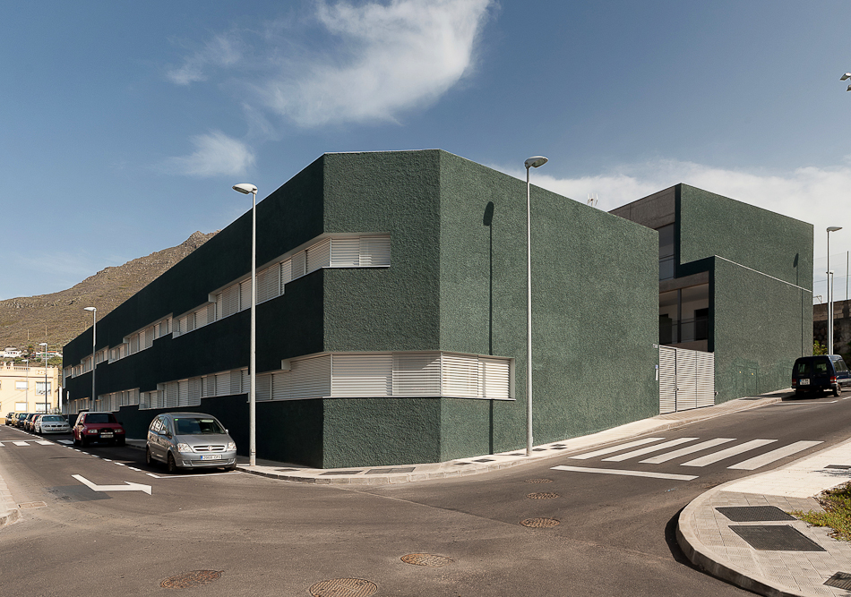 28 viviendas se organizan en dos volúmenes prismáticos pesados que se insertan en la parcela alineándose a las calles existentes y generando un espacio libre entre ambos donde se concentran las comunicaciones y que constituye el espacio de relación social desde el cual se produce el acceso desde la calle. En el exterior, una talla continua resuelve las aperturas de huecos en fachada, generando una sombra a lo largo de la misma que pone en evidencia la masa de los dos prismas geométricos. Los dos volúmenes están acabados con un tiroliano de árido grueso en toda su superficie excepto en la gran grieta esculpida, donde se utiliza una chapa minionda de aluminio microperforado que hace las veces de contraventana y de revestimiento.